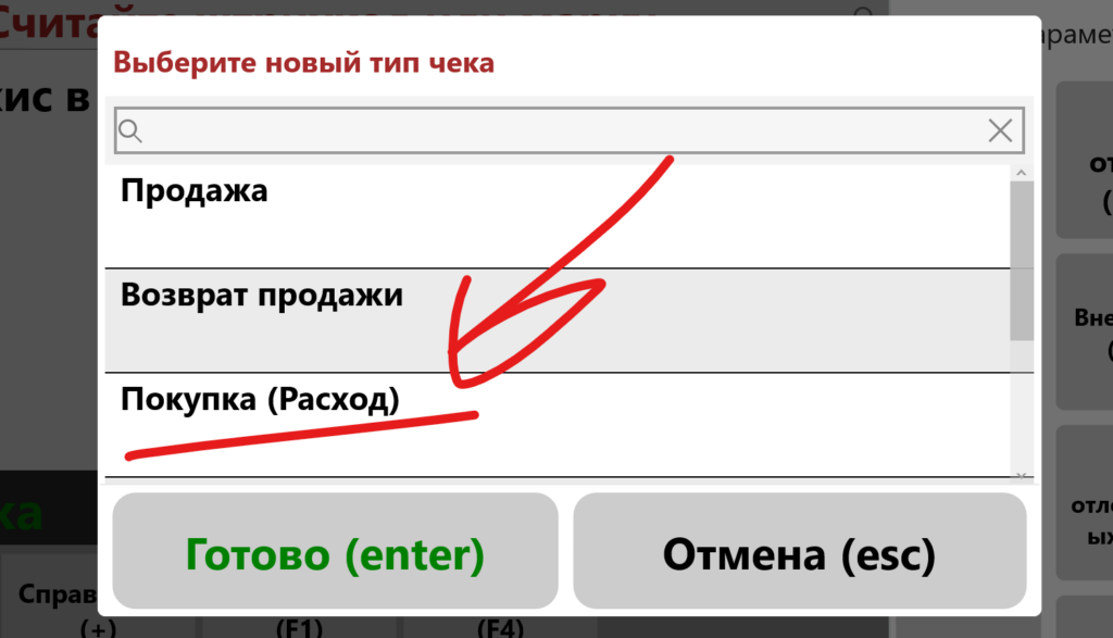 В окне выбора типа чека выберите строку «Покупка (Расход)» и нажмите Готово.