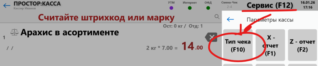 В режиме «Касса» нажмите кнопку «Сервис«. Там нажмите кнопку «Тип Чека«.