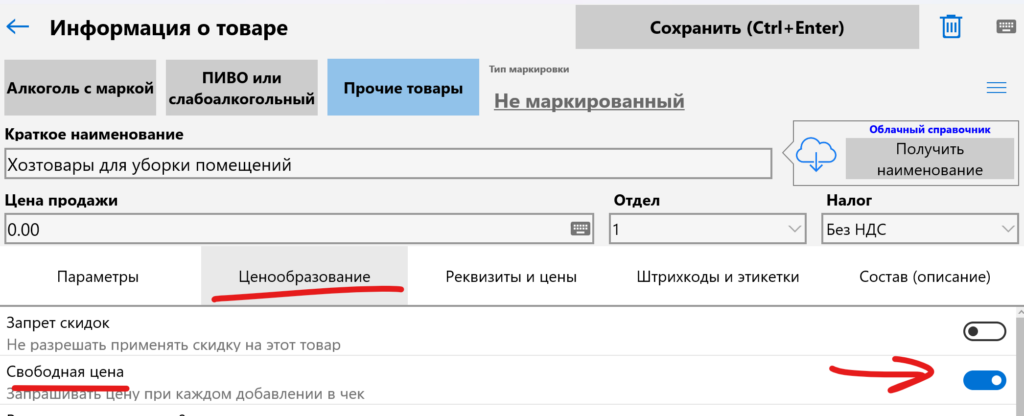 В карточке таких товаров можно поставить признак «Свободная цена«, тогда программа будет запрашивать цену этих товаров при каждом добавлении в чек.