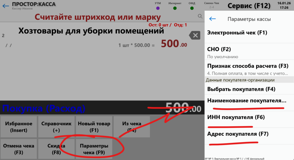 У вас сменится тип чека на «Покупка (Расход)«. Ваша задача теперь заполнить чек товарами или услугами, которые вы покупаете. Точно также как вы наполняете обычный чек.