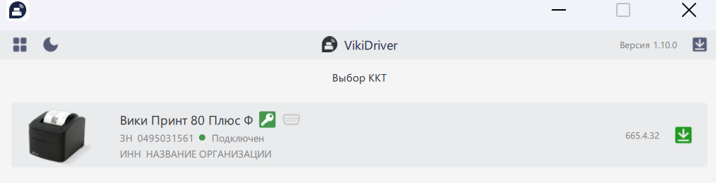 После установки драйвера, запустите приложение VikiClient и убедитесь что ваш ФР успешно определился драйвером и имеет статус подключен.