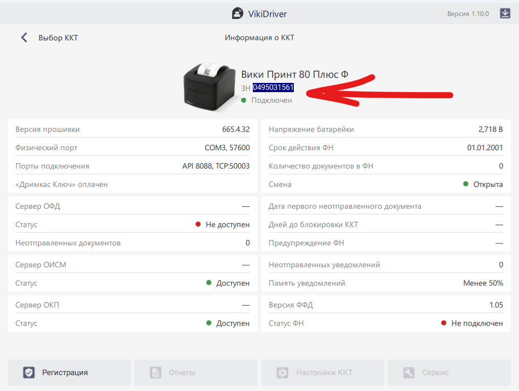- Заводской номер ФР. Укажите заводской номер ФР. Вы его можете получить на наклейке на самом аппарате или из приложения VikiClient, как показано выше. Номер ФР указать обязательно.