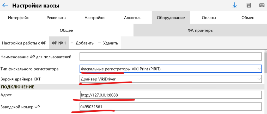 Перейдите в «Настройки — Оборудование» и включите переключатель «Фискальные регистраторы, принтеры чеков«. Перейдите на закладку «ФР и принтеры — ФР №1» (или тот номер ФР, который настраиваете, если у вас подключено несколько ФР). Выберите «Тип фискального регистратора» — «Фискальные регистраторы Viki Print (Pirit)«