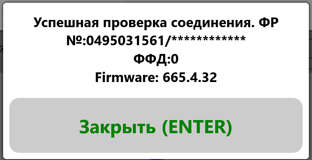 Для проверки связи с ФР можно нажать кнопку «Проверить настройки подключения«. При успешной проверке вы увидите окно с параметрами вашего ФР.
