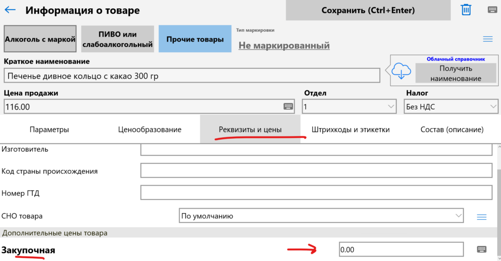 В карточке товара, закладка Реквизиты и цены есть поле «Закупочная цена«.