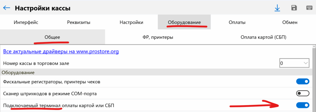 Перейдите в настройки программы. На закладке «Оборудование» включите переключатель «Подключаемый терминал оплаты картой или СБП«. У вас появится закладка «Оплата картой (СБП)«. Перейдите на эту закладку.