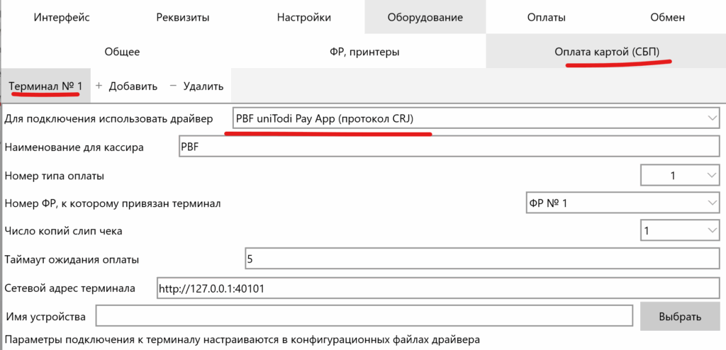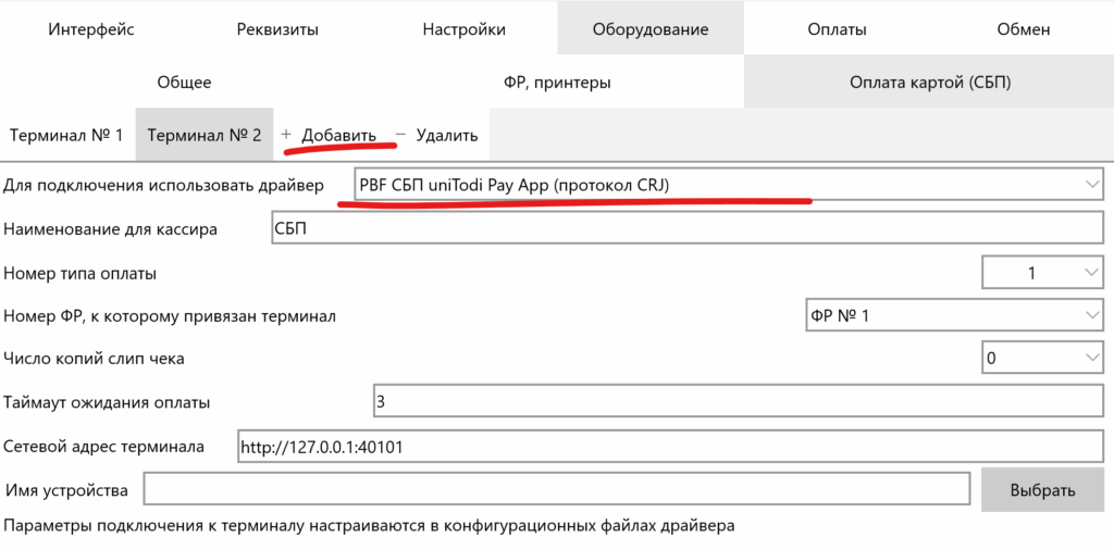 Для этого добавьте в настройку второй терминал оплаты по кнопке «+ Добавить«. и выберите драйвер «PBF СБП uniTodi Pay App (протокол CRJ)«.
