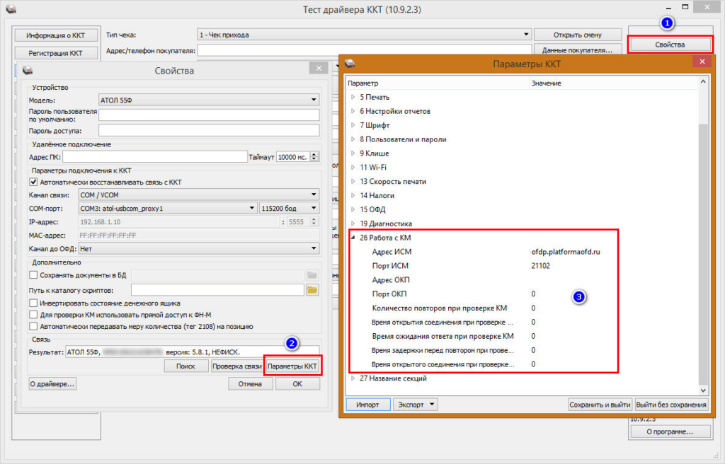 Для настройки адресов серверов ИСМ перейдите в раздел «Свойства» драйвера и там «Параметры ККТ«. Раздел «Работа с КМ«.